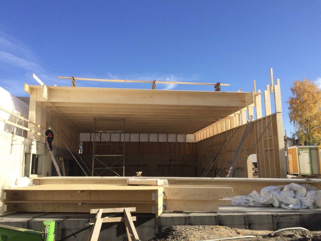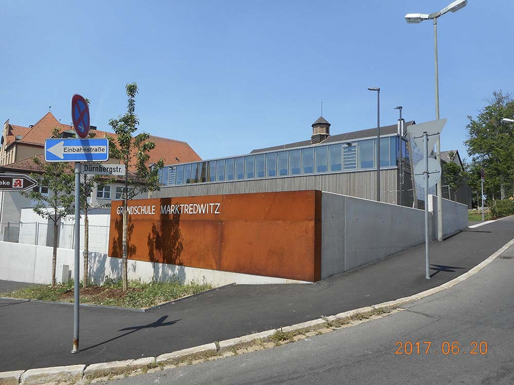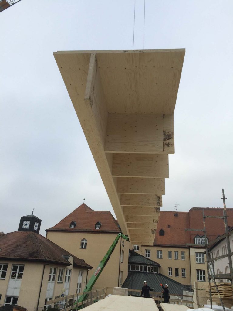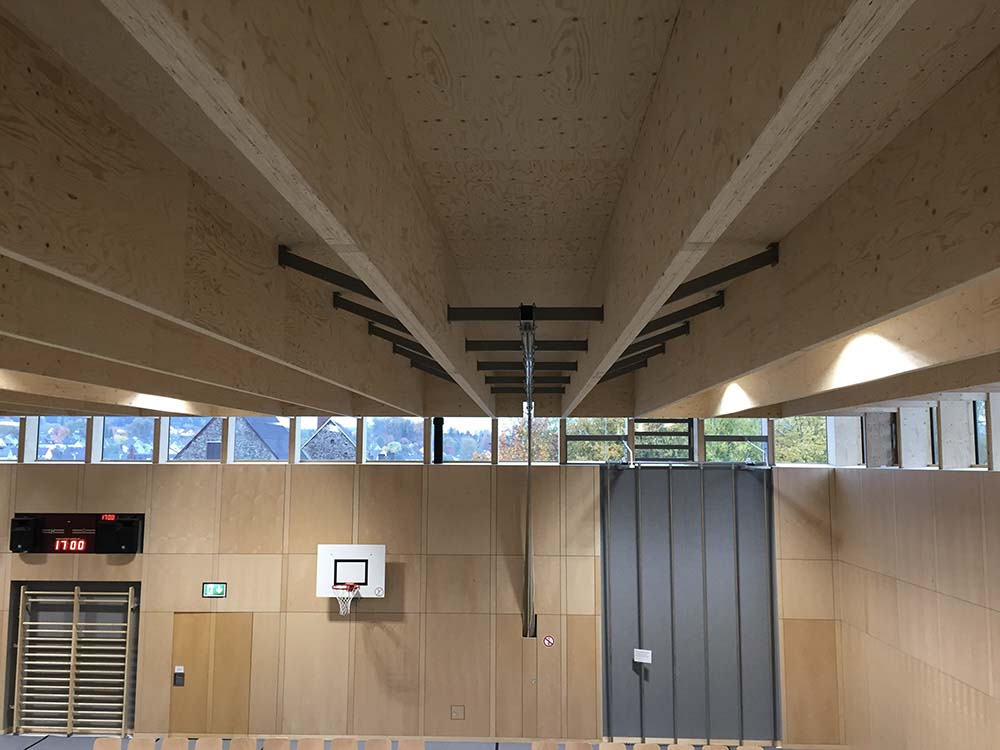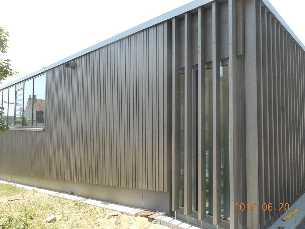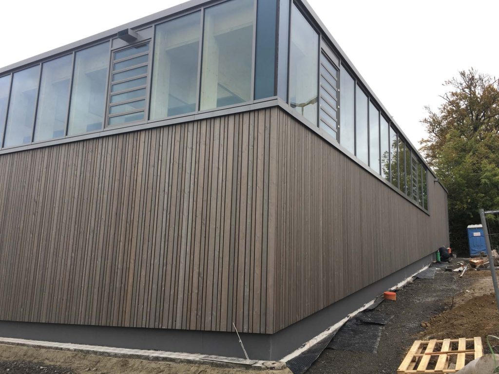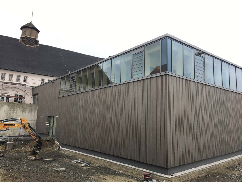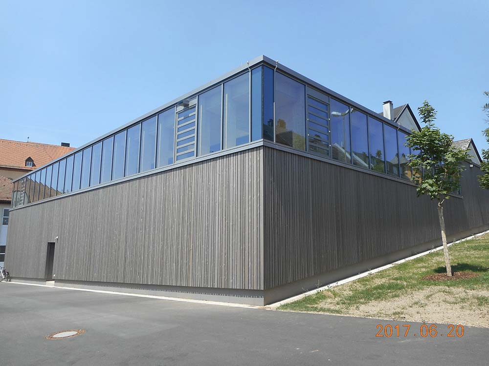 Neue 1-fach Turnhalle in Marktredwitz: moderner Holzbau im denkmalgeschützten Ensemble, Brettschichtholz-Konstruktion und vorvergraute Lärchenfassade.