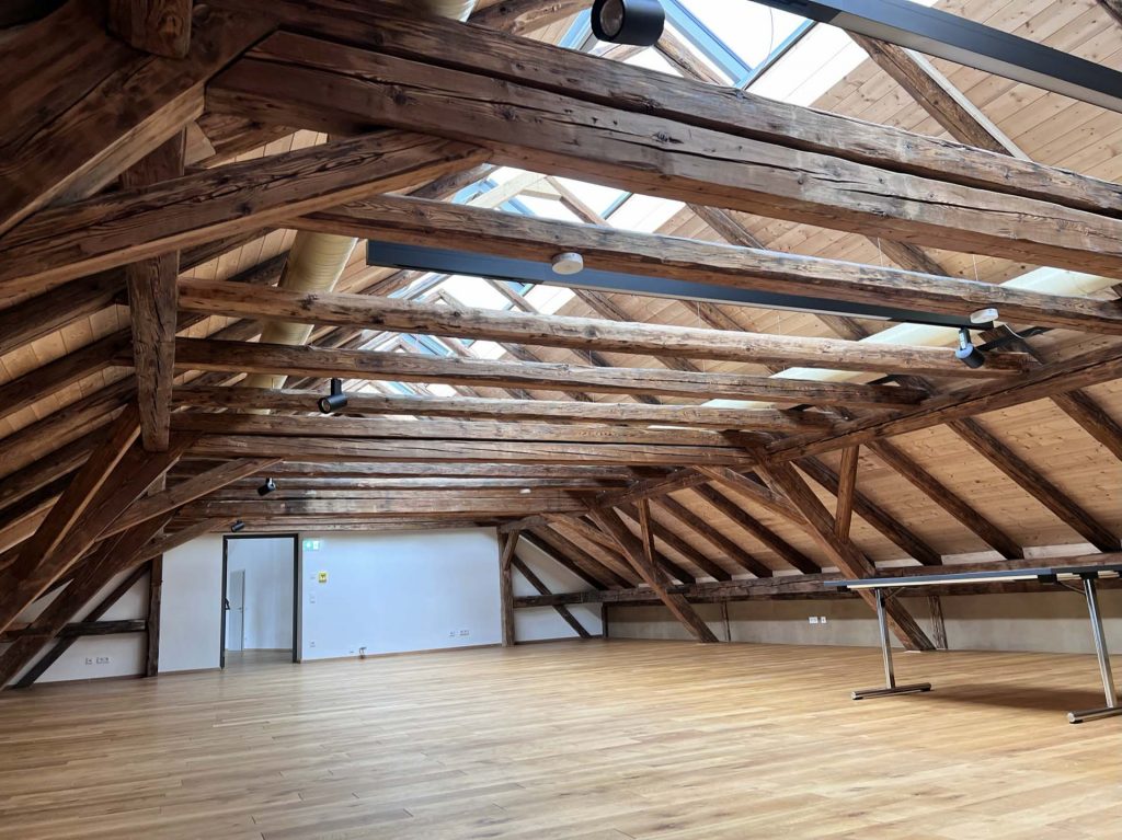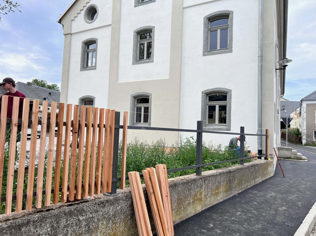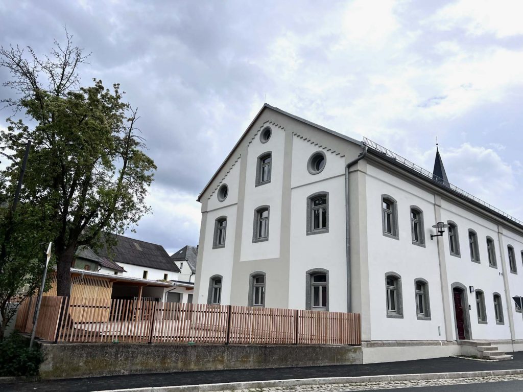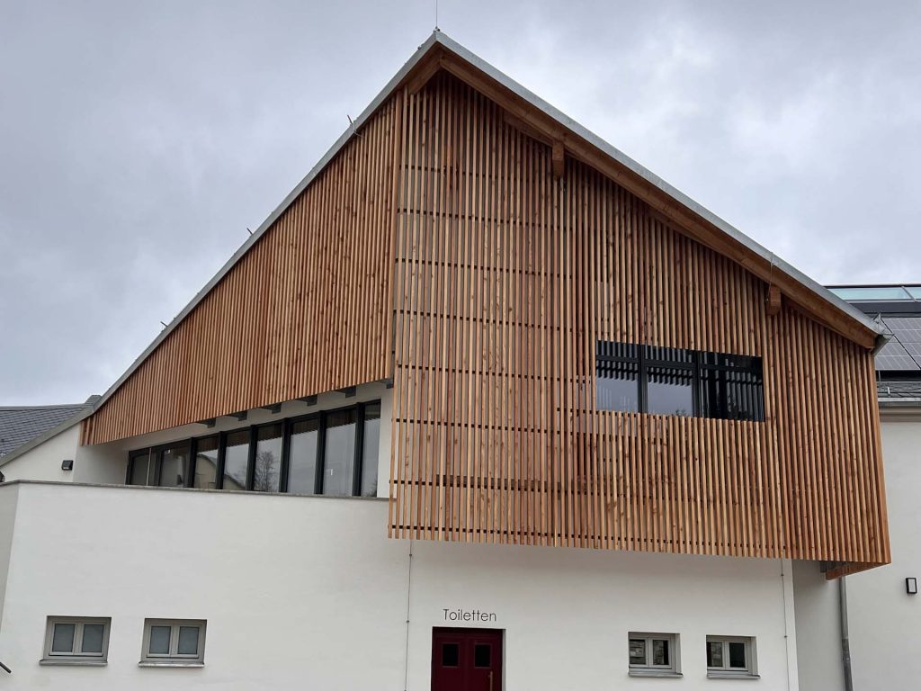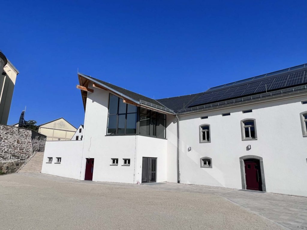 Umbau des historischen Sackhofs zum Bürgerhaus in Schirnding: Erneuerung von Dachstuhl und Decken, Naturschiefereindeckung und Neubau eines Anbaus mit neuem Dachstuhl.