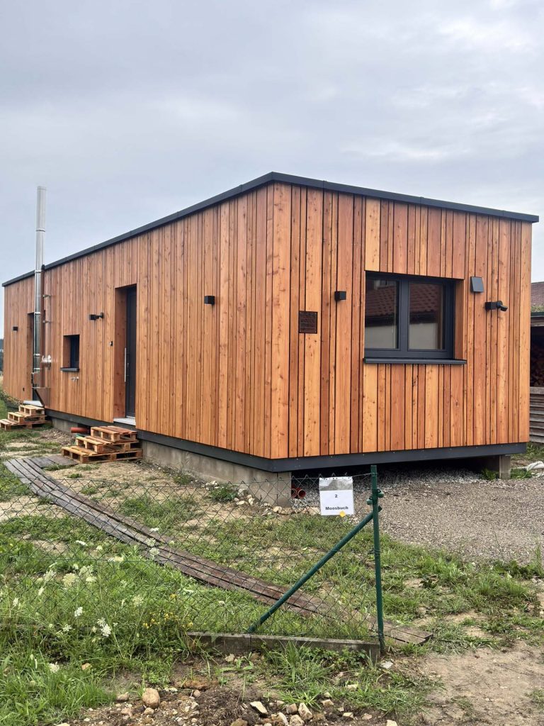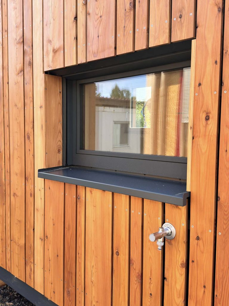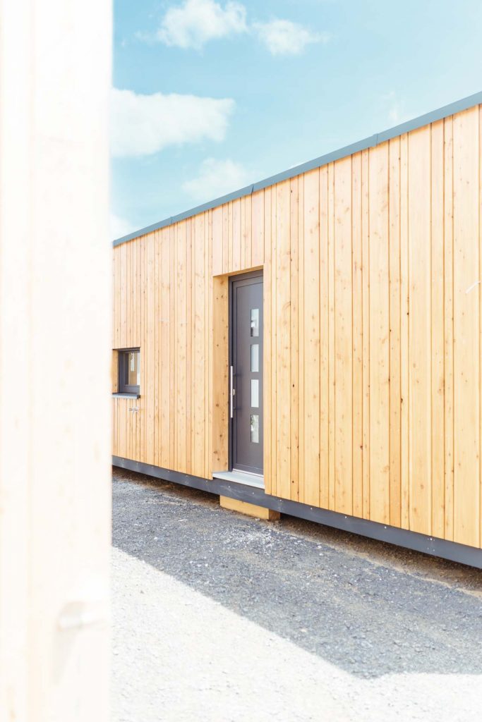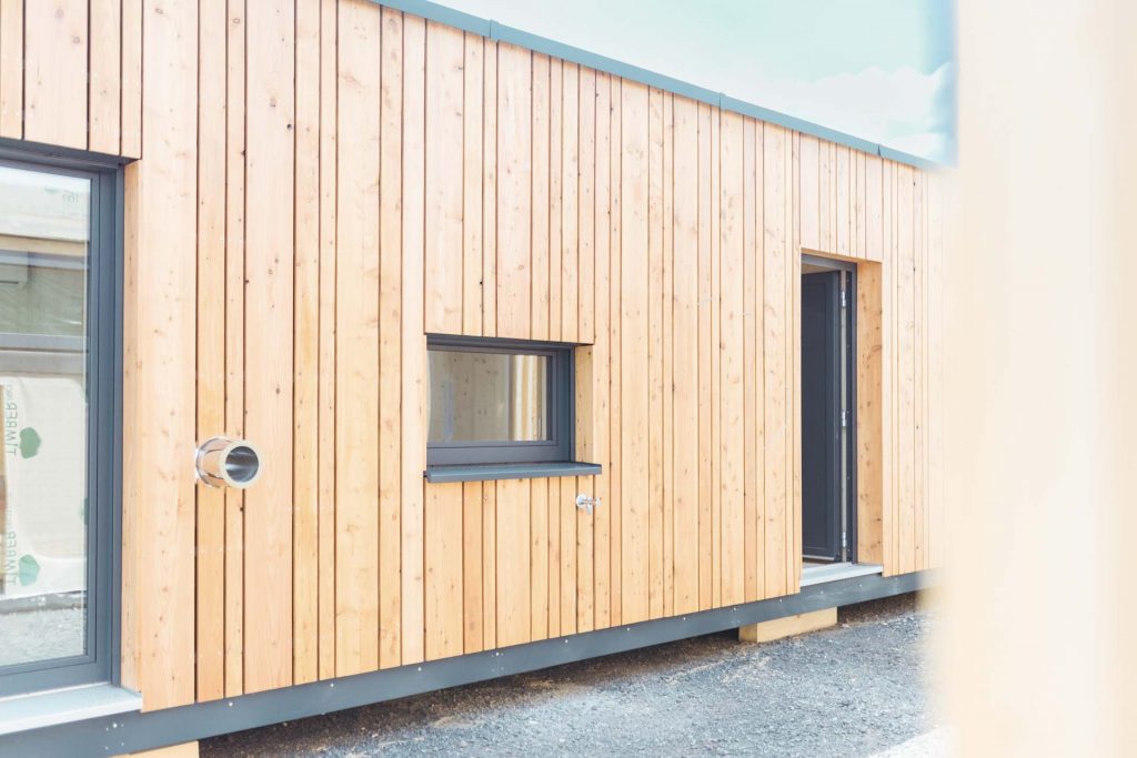 „Chaosverschalung“ dient als hinterlüftete Fassade mit drei verschiedenen Brettbreiten – geölt mit ökologischem Öl zur Verzögerung des Vergrauungsprozesses