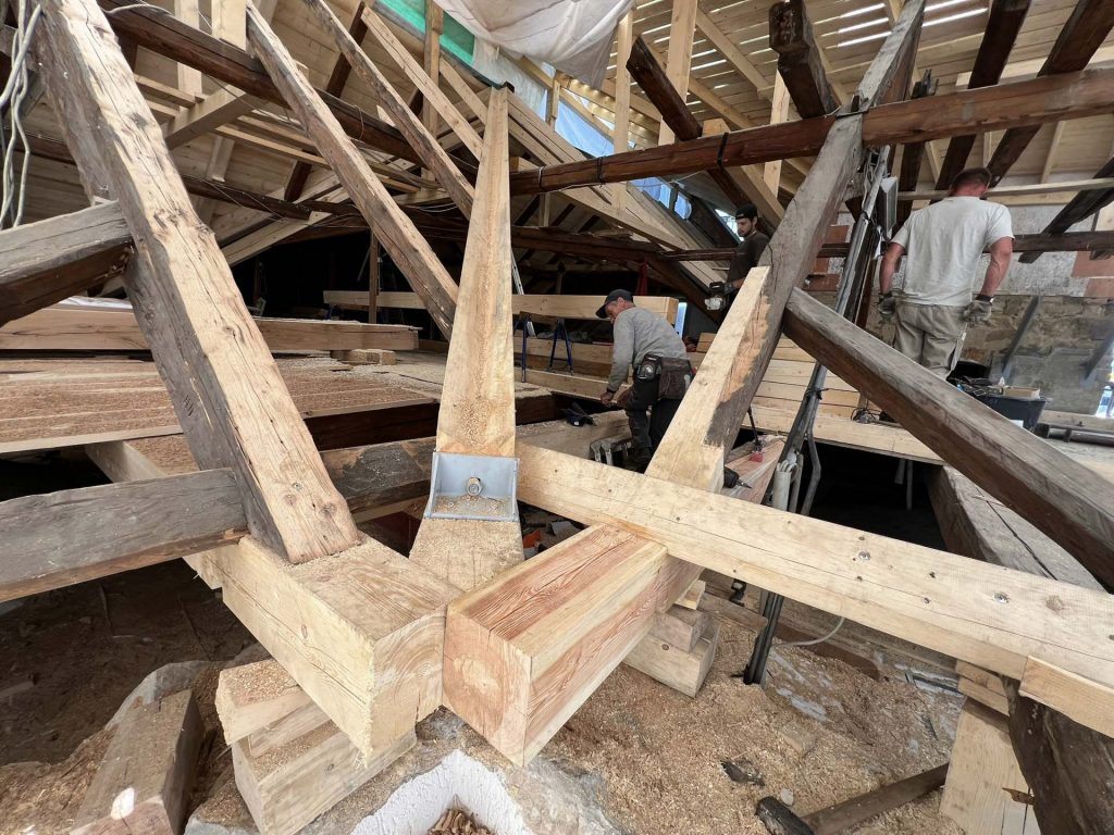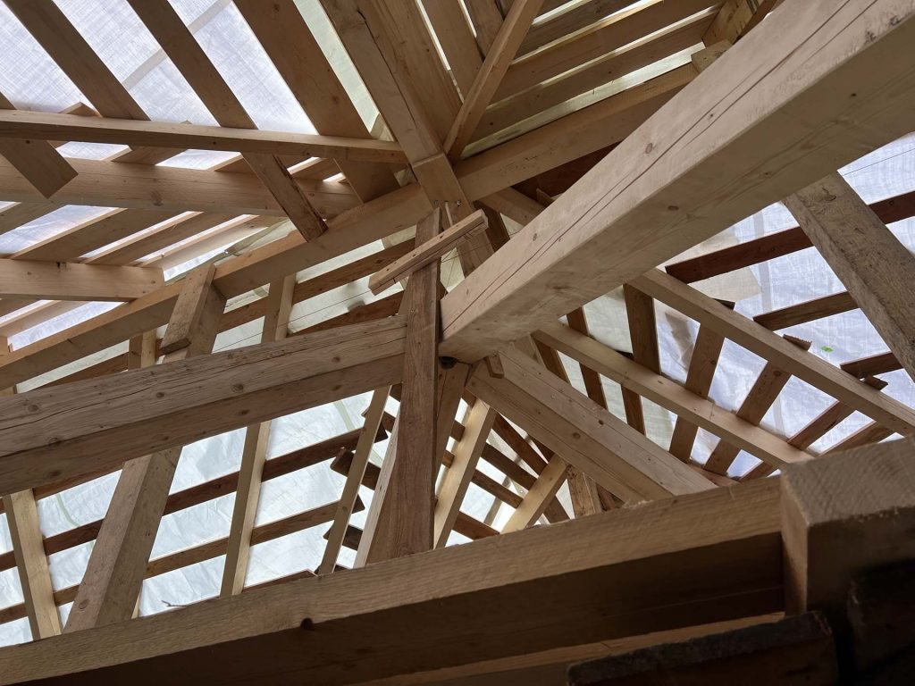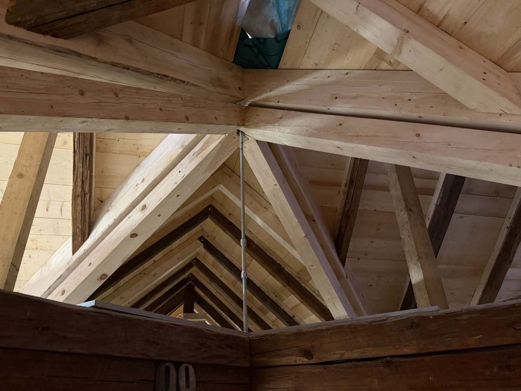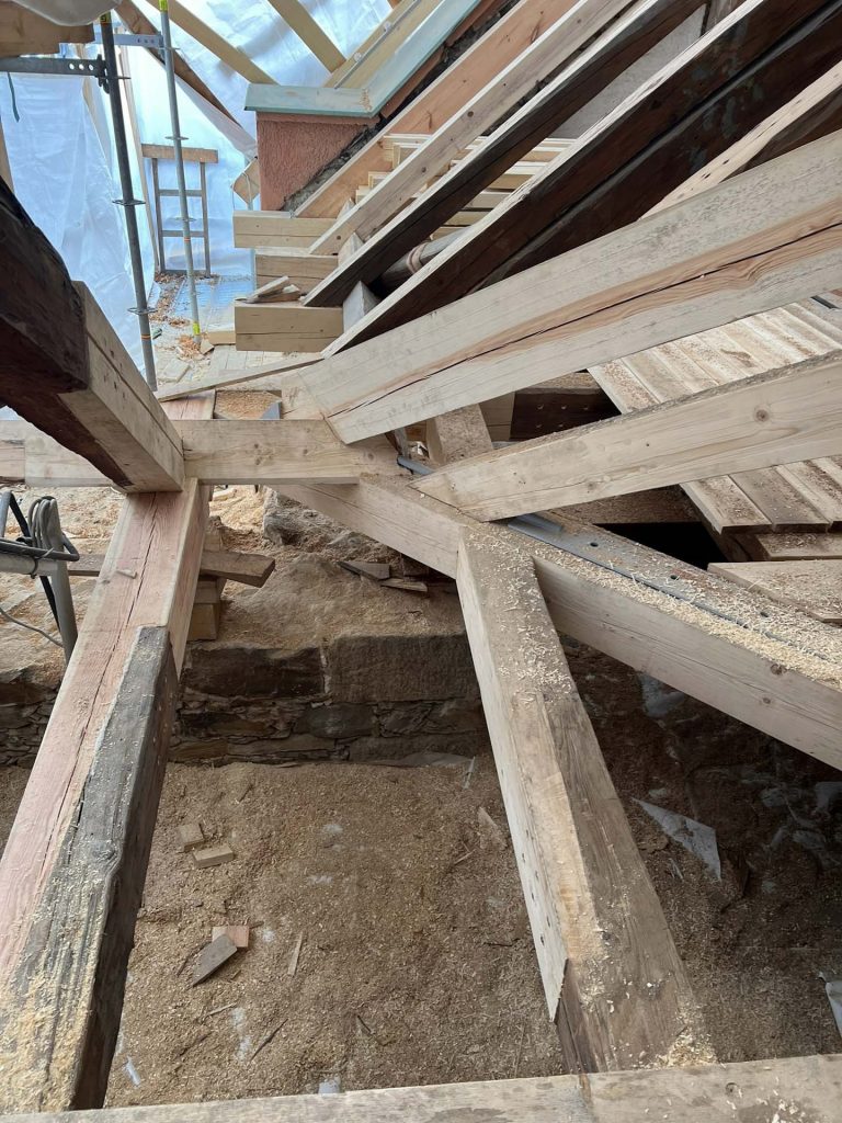 Erneuerung des historischen Dachstuhls und statische Ertüchtigung mit präziser Handwerksarbeit.
