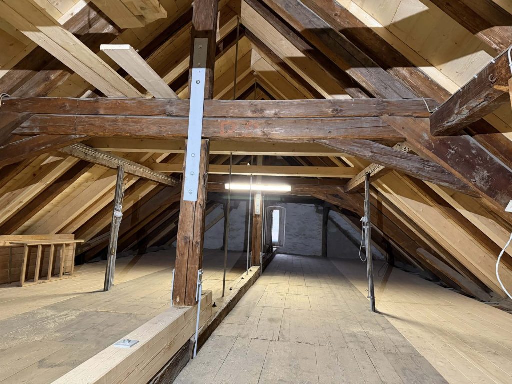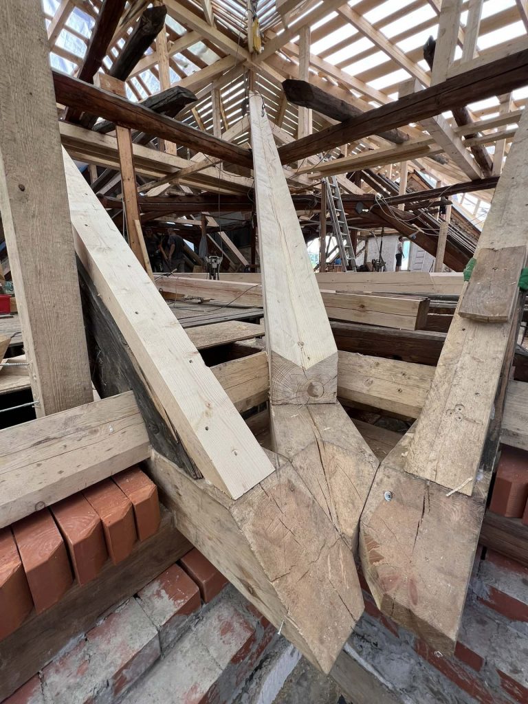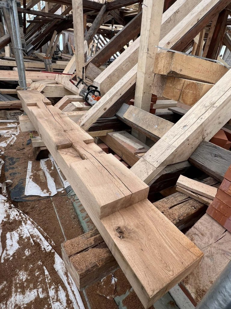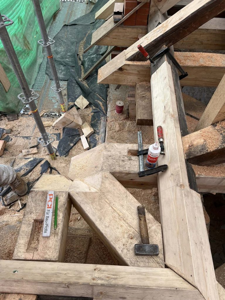 Erneuerung des historischen Dachstuhls und statische Ertüchtigung mit präziser Handwerksarbeit.