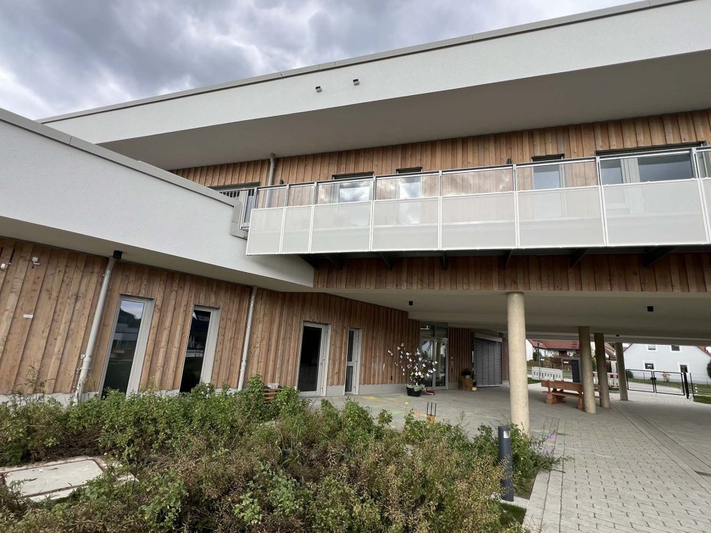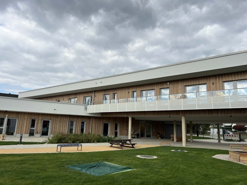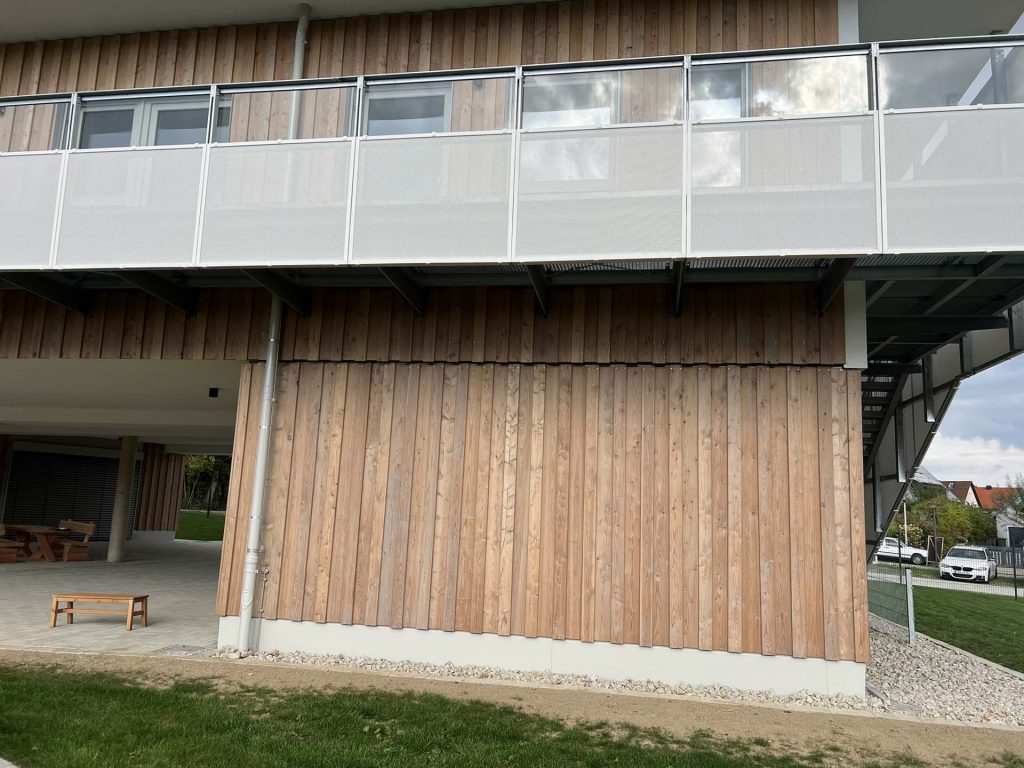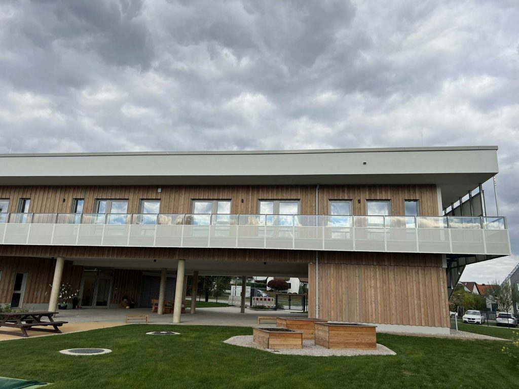 KITA Waldershof mit senkrechter, hinterlüfteter Lärchenfassade – gekalkt und langlebig ausgeführt für ein natürliches Erscheinungsbild.