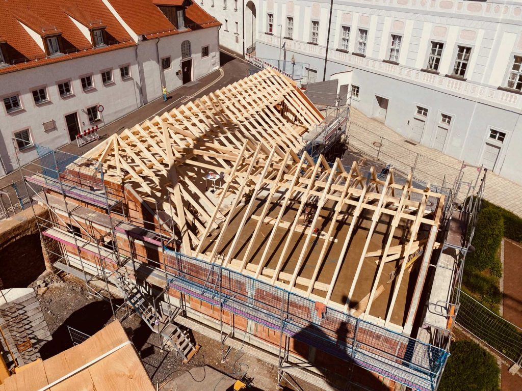 Walmdach für das Werkstattgebäude des Klosters Waldsassen: zimmermannsmäßig abgebunden, geliefert und präzise aufgerichtet – Handwerk im historischen Kontext.