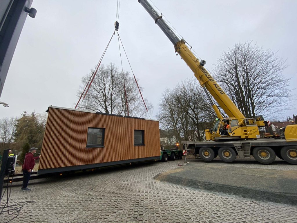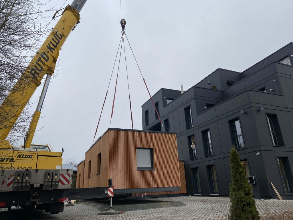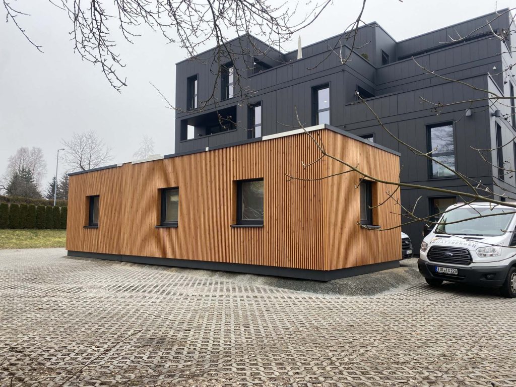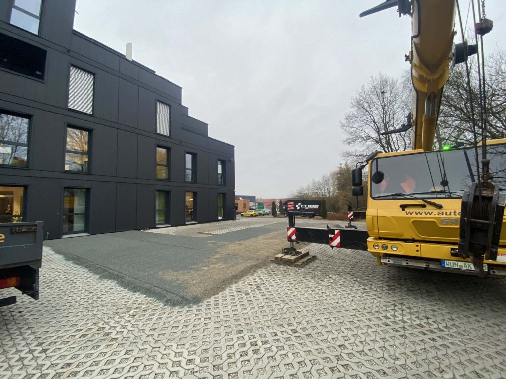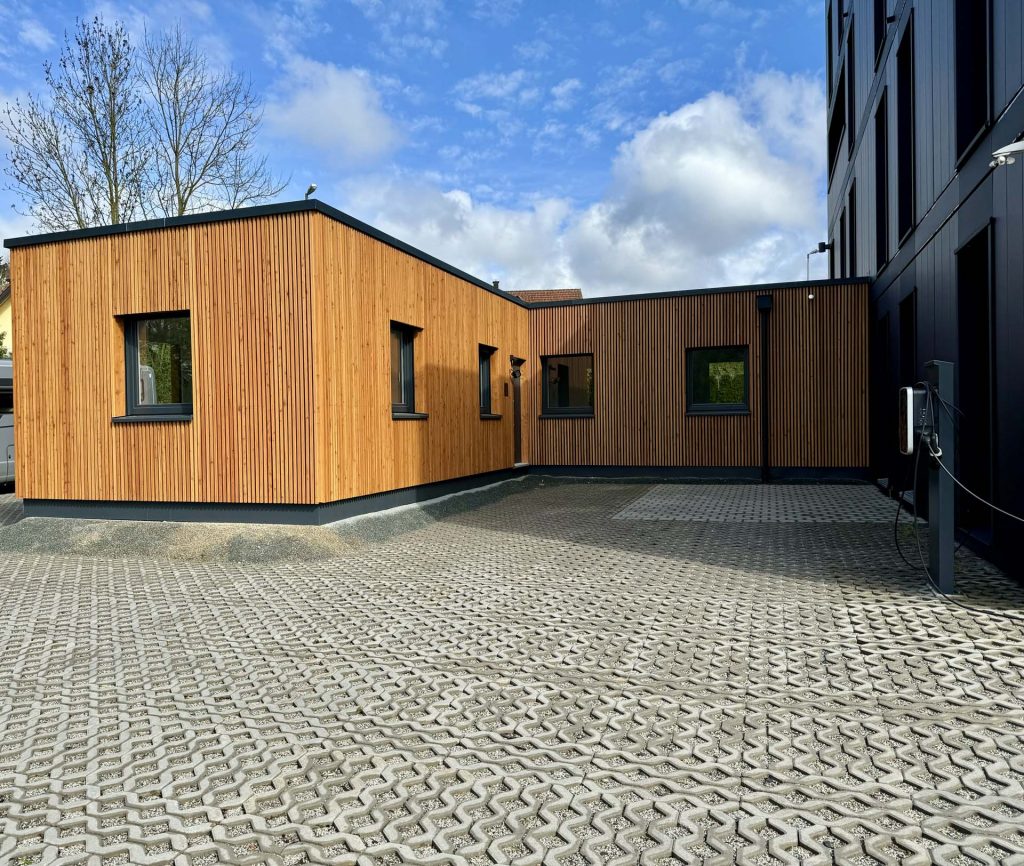 Erweiterung des Bestandes in L-Form auf Parkplatz: unkompliziert, effizient & schnell.